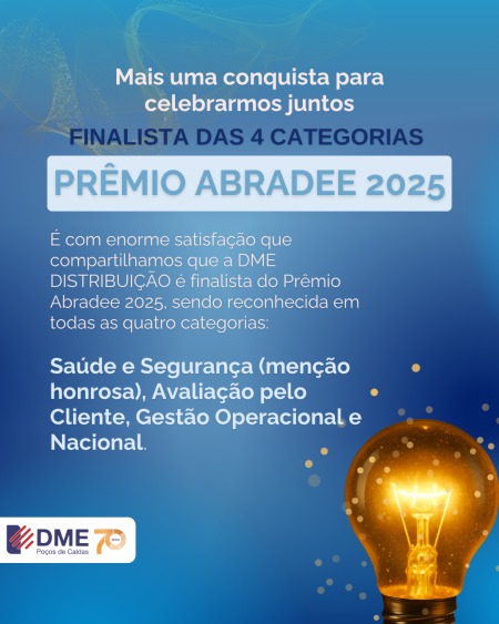 A DME Distribuição é finalista em todas as categorias existentes, entre as distribuidoras com menos de 500 mil consumidores, a saber: Saúde e Segurança (menção honrosa), Avaliação pelo Cliente, Gestão Operacional e Nacional.